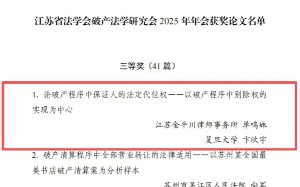 江苏金平川律师事务所单鸣姝律师论文荣获江苏省法学会破产法学研究会2025年年会优秀论文三等奖